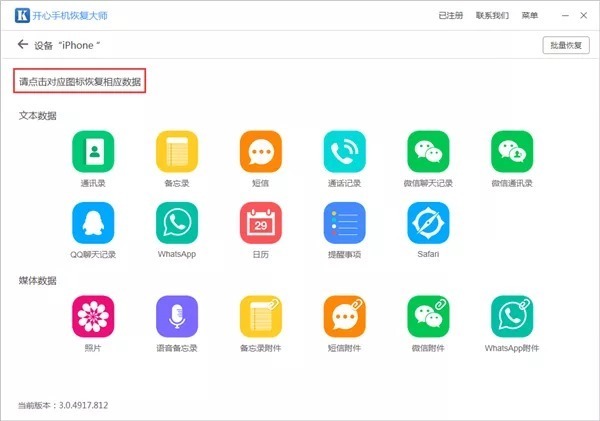 第三步:跳转到开心手机恢复大师的功能界面,我们可以看到许多数据均支持恢复,如微信记录、短信、备忘录、通讯录、照片等,点击【微信聊天记录】图标,点击图标后软件开始扫描分析设备数据库中的相应数据。