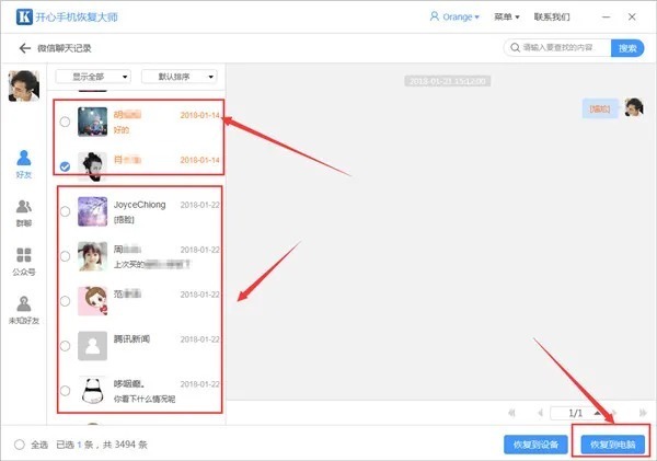 第四步:进入微信聊天记录的恢复界面后,橙色字体是删除的数据,黑色的字体是未删除的数据。勾选自己需要恢复的数据,选择【恢复到电脑】即将勾选的数据恢复到电脑上;选择【恢复到设备】即将勾选的数据恢复到手机App恢复大师上(自制的恢复大师APP,非微信APP);